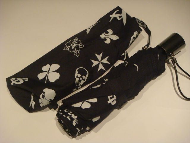 lucien pellat-finet のアイコンが全面にプリントされた、折りたたみ傘。